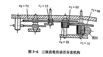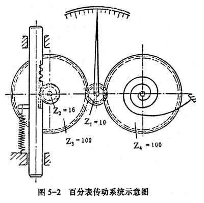 百分表的传动系统最常见的是二级传动,如图5-2所示,其传动原理如下:当测杆被工件抬高1毫米时,齿条上升1.6齿,由于齿轮Z2是16齿所以齿条推动齿轮Z2转动/10转.与Z2同轴的大齿轮Z3转过 1×1/10=100齿。小齿轮Z1是10齿,经Z3带动后,Z1及固定在其轴上的长指针下好转一周.因为刻度盘为100等分,故当测杆移动1毫米时,长指走100分度.由此可知,指针转过一个分度,相当于测杆移动0.01毫米.