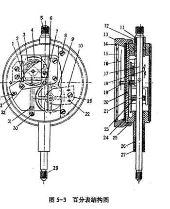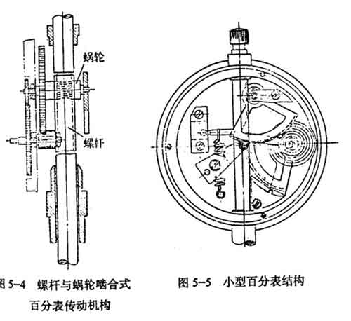 图5-4.为螺杆与蜗轮啮合式百分表的传动机构.它的第一级为带有螺旋线的螺杆与蜗轮传动.这种表的刻度盘一般是不可转动的,调零靠旋旋转螺杆来实现,