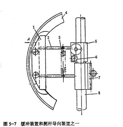 (一)缓冲装置 当百分表测杆受到突然冲击时,测杆上的齿轮的啮合点瞬时受力很大,容易损坏齿轮,为克服这一缺陷,有的百分表采用了图5-7所示的缓冲装置.图中固定块5由螺钉6固定在测杆8上,齿条7可以在测杆上滑动,并借助拉力弹簧3紧密地靠在固定块上,当测杆向上急速运动时,如果作用力大于弹簧的拉力,测杆与齿条便发生相对运动,产生缓冲作用,避免齿轮受损.