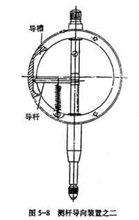 (二)测杆导向装置 测杆导向的方式很多,除图5-3所示的以外,常见的还有图5-7到图5-15所示的几种.在图5-7中,采用双导杆2导向.导杆的一端插入导槽块1的导槽中,另一端分别与固定块5和齿条7连接.导槽块由三块组成,用螺钉固定在表体4上(见A-A局部社图).此结构导向作用稳定可靠,并且便于调整和修理.在图5-8中,导槽直接做在表体的内圆上,修理较困难.在图5-9中,导槽做在表体中部的突台上.在图5-10中,用导板代替导杆,导板固定在测杆上.测杆移动时,导板两端的凸出部分沿着后盖内表面滑动(图5-10a),或导板沿着后盖上两个凸起的平面导轨滑动(图5-10b).这种导向装置的缺点是,卸下后盖就失去导向作用;优点是容易修理.图5-11是较理想的一种导向结构.导杆伸进导槽内的一端做成球形,导槽块可以拆卸,因而修理时容易使导槽与导杆得到良好的配合图5-12所示结构是用螺钉将导杆夹持在测杆上,导杆的位置可以调节.在图5-13所示的百分表中,后盖和表体制成一体,导槽1直接开在后盖的内平面上,导杆2固定在测杆5上,可沿导槽上下滑动.在图5-14中,导槽块4固定在圆座板上,导杆5在导槽中滑动. 图5-15所示的导向装置是利用导板5和导槽4导向,其结构与图5-8相似.